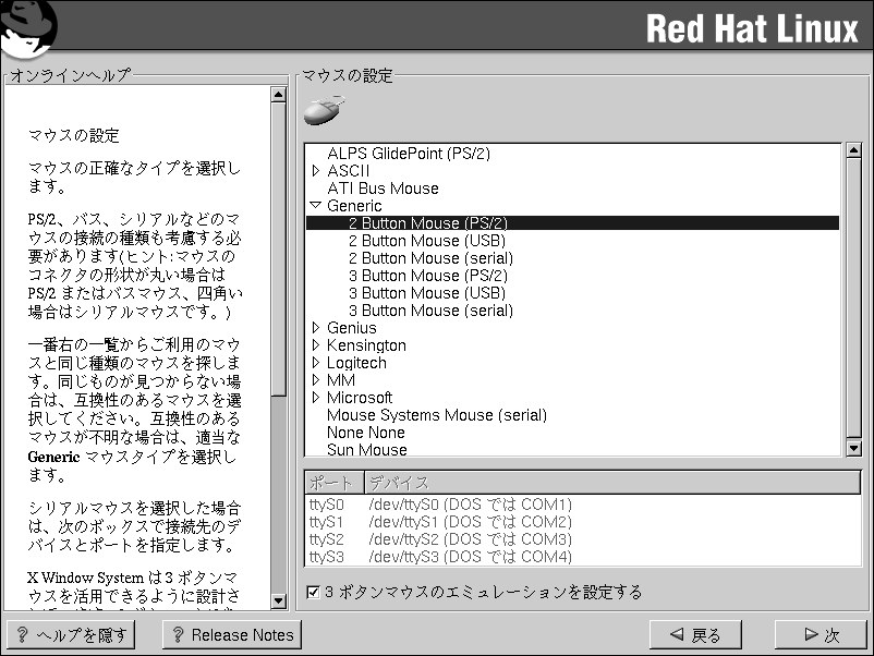 [3ボタンマウスのエミュレーションを設定する]チェックボックスを使用すれば、2ボタンマウスを3ボタンマウスのようにして使用することができます。一般に、3ボタンマウスを使用する場合、X Window Systemがより使いやすくなります。このチェックボックスを選択した場合、両方のマウスボタンを同時に押すことによって、3番目のボタン(中央ボタン)をエミュレートすることができます。