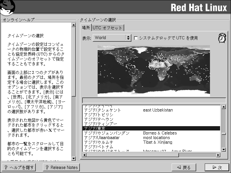 Red Hat Linuxシステムを起動した後でタイムゾーン設定を変更したい場合は、rootになり、/usr/sbin/timeconfigコマンドを使用します。 |