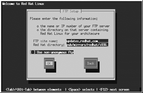FTPサイトの完全修飾ドメイン名かIPアドレスと、インストール先のアーキテクチャ用のバージョンのRedHatインストールファイルを含むFTPサイト上のディレクトリ名を入力します。たとえば、FTPサイトのディレクトリが/pub/mirrors/redhat/i386/RedHatの場合、/pub/mirrors/redhat/i386と入力します。