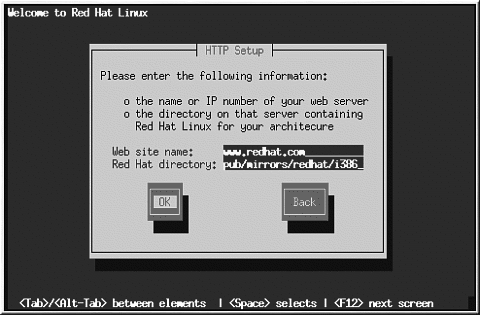 Red Hat Linuxのインストール元にするHTTPサイトの名前かIPアドレス、インストール先のアーキテクチャ用のバージョンのRedHatインストールファイルを含むディレクトリの名前を入力します。たとえば、HTTPサイトの/pub/mirrors/redhat/i386/RedHatというディレクトリの場合は、/pub/mirrors/redhat/i386と入力します。