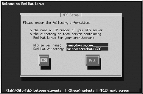 NFSサーバーでは、/mnt/cdrom上にRed Hat LinuxのCDをマウントしたとします。この場合、/mnt/cdromを[Red Hatディレクトリ]フィールドに入力します。 NFSサーバーが、CDではなく、Red Hat Linuxインストールツリーのミラーをエクスポートしている場合は、RedHatディレクトリを含むディレクトリを入力します。たとえば、NFSサーバーが/mirrors/redhat/i386/RedHatというディレクトリを含むとすれば、/mirrors/redhat/i386と入力します。