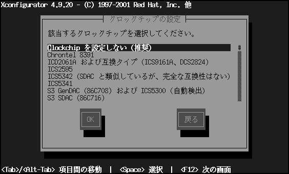 次に、ビデオカードでクロックチップをサポートする場合(チップがある場合)は、クロックチップの設定値を選択します。ほとんどのビデオカードの場合、Xfree86が自動的に適切なクロックチップを検出するため、[ClockChipを設定しない]を選択するのがよいでしょう。