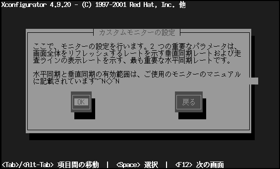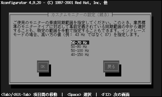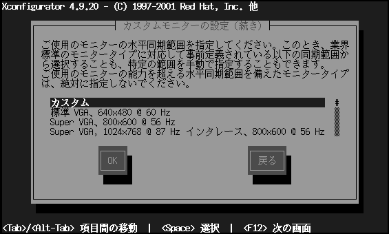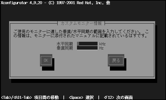 [カスタム]を選択した場合、Xconfiguratorは、使用しているモニタの水平同期と垂直同期の範囲を選択するように指示します(通常、これらの値はモニタに付属する取扱説明書に記載されています。説明書が手元になければ、モニタのベンダーやメーカーから必要な情報を入手することもできます)。