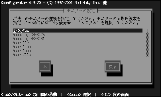 Xconfiguratorは、まずモニタのリストを表示します(Figure 5-10を参照)。使用しているモニタがリストにある場合は、そのモニタを選択してEnterキーを押します。そうでない場合は、[カスタム]を選択します。