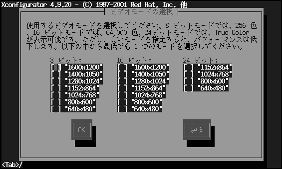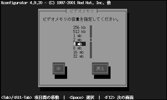カードにあるメモリの容量がわからない場合は、ビデオカードに添付された取扱説明書を確認してください。カードにあるメモリよりも大きい容量を選択してもカードを損傷することはありませんが、XFree86サーバーが正しく起動しない原因となる場合があります。