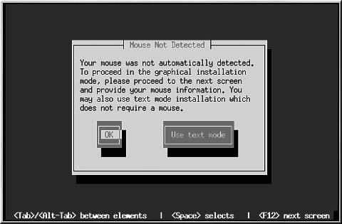 GUIインストールを続行するか、マウスの使用を必要としないテキストモードインストールを行うか選択できます。GUIインストールでの続行を選択した場合、インストールプログラムにマウスの設定情報(Figure 4-3を参照)を提供する必要があります。