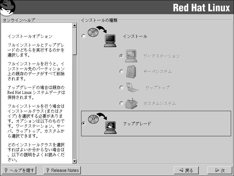 インストール処理の中で、インストールオプションを選択する画面が表示されます。システムをアップグレードしたい場合は、ここで、インストールの種類として[アップグレード]が選択されていなければなりません(Figure A-1を参照)。