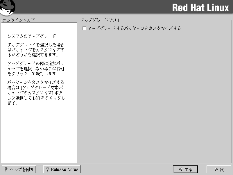 インストールプログラムに、自動的にアップグレード処理をさせるには、[アップグレードするパッケージをカスタマイズする]がチェックされていないことを確認し[次]をクリックします(the section called パッケージのアップグレードを参照)。