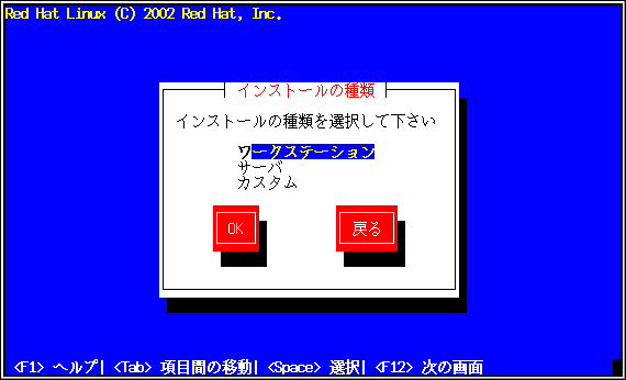Red Hat Linux では目的に最も適したインストールタイプを選択することができます。 選択オプションはワークステーション、サーバ 及びカスタムです。