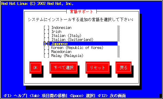システムで複数の言語を使用する場合は、インストールする言語を個別に選択するか、 すべての言語を選択して利用可能なすべての言語をRed Hat Linuxシステムにインストールします。