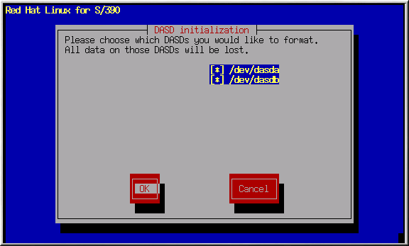 カーネルがDASDドライバーをロードしてDASDデバイスを検出した後、それらをフォーマット するように指示が出ます。新規に作成されたパーティションはすべてフォーマットされる 必要があります。さらに、不要なデータを保存している既存のパーティションもフォーマット されるべきです。DASDのフォーマットプログラムは選択されたDASDをすべて同時に フォーマットしますので、かかる時間は1番長いDASDパーティションにかかる時間です。 注:2 GBのDASDパーティションには完了するまで約20分位かかります。