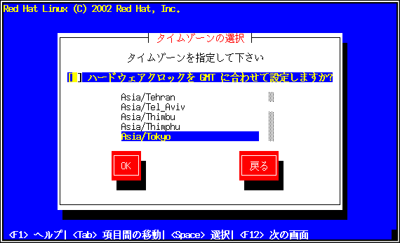 ハードウェア(CMOS)クロックを、GMT(Greenwich Mean Timeまたは、UTCと呼ばれる世界協定時間)に セットしたい場合は、ハードウェアクロックをGMTに合わせて設定するを選択します。 GMTにセットするということは、ユーザーのゾーンが夏時間を使用する場合は、それを適切に 処理することになります。