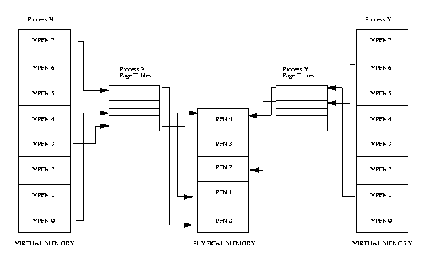 仮想メモリ機構は、複数のプロセスでのメモリの共有を実現しやすくする。メモリ へのアクセスはすべてページテーブル経由で行われ、プロセスはそれぞれ自分の独立 したページテーブルを持っている。ふたつのプロセスがメモリ内の物理ページを共有す るには、その物理ページのフレーム番号が、両者のページテーブル内のエントリに 存在する必要がある。