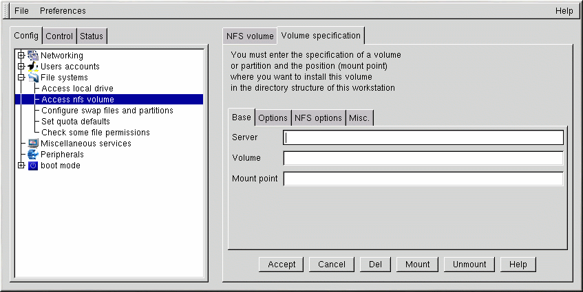 This is all you need to get the mount created. Linuxconf will update your /etc/fstab file accordingly. If you are aware of additional requirements, please read the help file on the Volume specification screen and see the mount man page for more information.