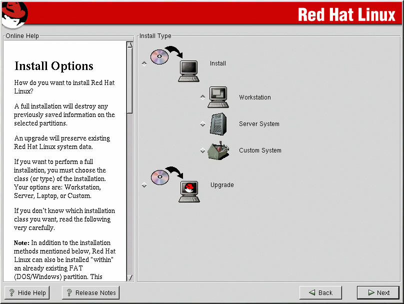 Red Hat Linux allows you to choose the installation type that best fits your needs. Your options are Workstation, Server, Custom, or Upgrade.
