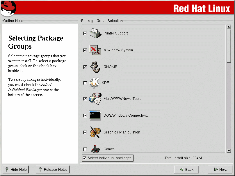 Some packages (such as the kernel and certain libraries) are required for every Red Hat Linux system and are not available to select or deselect. These base packages are selected by default. |