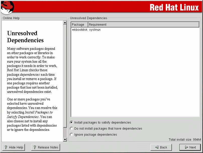 If any package requires another package which you have not selected to install, the program presents a list of these unresolved dependencies and gives you the opportunity to resolve them (see Figure 4-16).