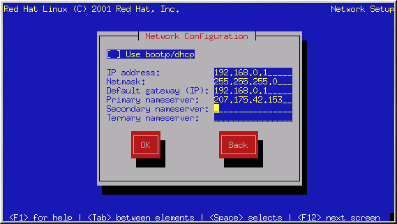If you do not use bootp/dhcp, enter, where applicable, the IP Address, Netmask, Default gateway (IP), Primary nameserver, Secondary nameserver, and Ternary nameserver. If you are unsure of any of these, please contact your network administrator.