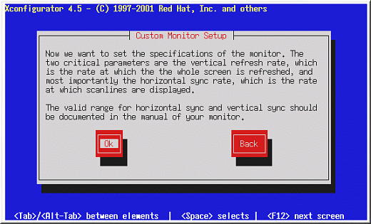 If you select Custom, Xconfigurator prompts you to select the horizontal sync range and vertical sync range of your monitor (these values are usually available in the documentation which accompanies your monitor, or from your monitor's vendor or manufacturer).