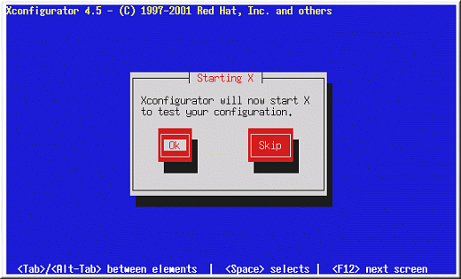 Once you have either selected the default video mode or specified a different mode, the Starting X dialog lets you test your X configuration.