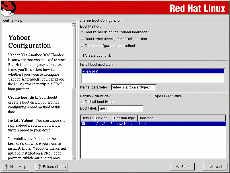 In order to boot your Red Hat Linux system, you usually need to install either YABOOT or the linux kernel in a PReP boot partition. The PReP boot partition must be a primary partition, ie: sdx1-sdx4, where sdx is the disk containing the root ("/") partition.