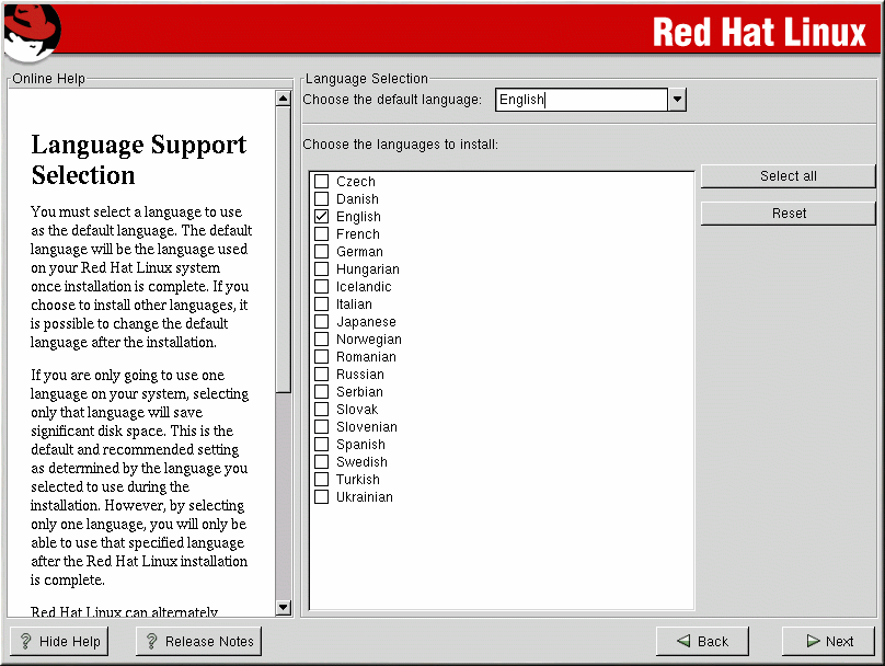 You must select a language to use as the default language. The default language will be used on your Red Hat Linux system once installation is complete. If you choose to install other languages, you can change your default language after the installation.