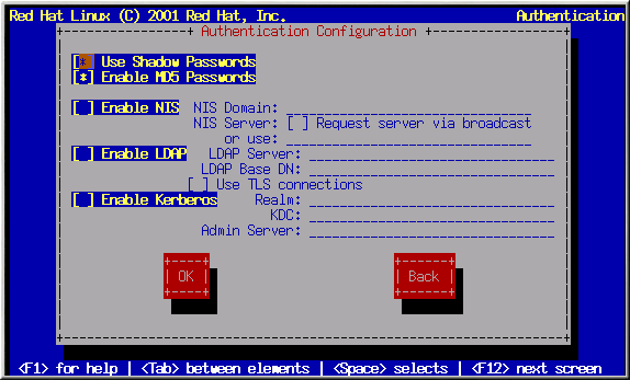 Enable Kerberos — Kerberos is a secure system for providing network authentication services. For more information about Kerberos, see Using Kerberos 5 on Red Hat Linux in the Official Red Hat Linux Reference Guide. There are three options to choose from here: