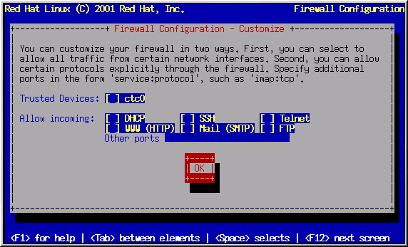 No firewall provides complete access to your system and does no security checking. Security checking is the disabling of access to certain services. It is recommended that this only be selected if you are running on a trusted network (not the Internet), or if you plan to do more detailed firewall configuration later.