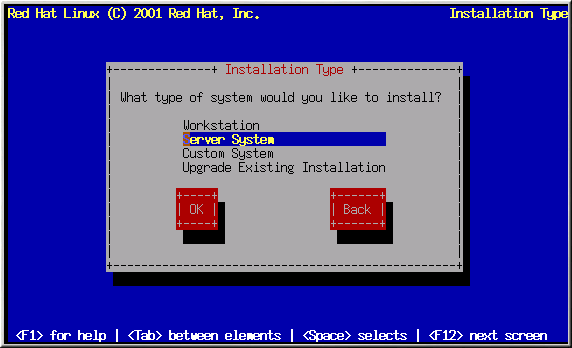 Red Hat Linux allows you to choose the installation type that best fits your needs. Your options are Workstation, Server, or Custom.