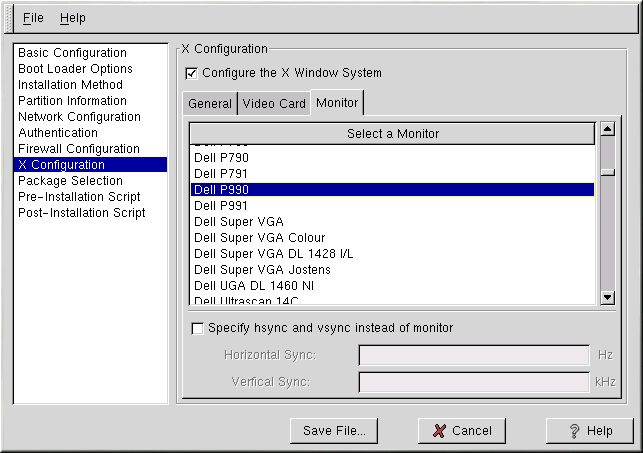 After configuring the video card, click on the Monitor tab shown in Figure 2-11 and select the monitor for the system. You can specify the horizontal and vertical sync rates instead of specifying a monitor by checking the Specify hysnc and vsync instead of monitor option. This option is useful if the monitor for the system is not listed. Notice that when this option is enabled, the monitor list is disabled.