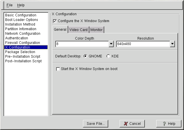 The first step in configuring X is to choose the default color depth and resolution. Select them from their respective pulldown menus. Be sure to specify a color depth and resolution that is compatible with the video card and monitor for the system.