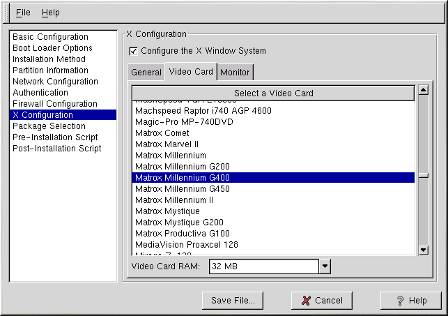 Select the video card from the list on the Video Card tab as shown in Figure 2-10. Also select the amount of video RAM the selected video card has from the Video Card RAM pulldown menu.