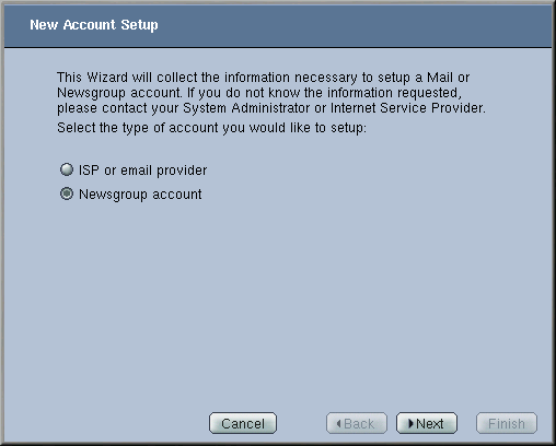 To join a newsgroup, you first need to set up a newsgroup account. Click on your mail account name in the sidebar and select Create a new account from the options that appear on the right of the screen. The New Account Setup screen appears. Select Newsgroup account and click on Next.