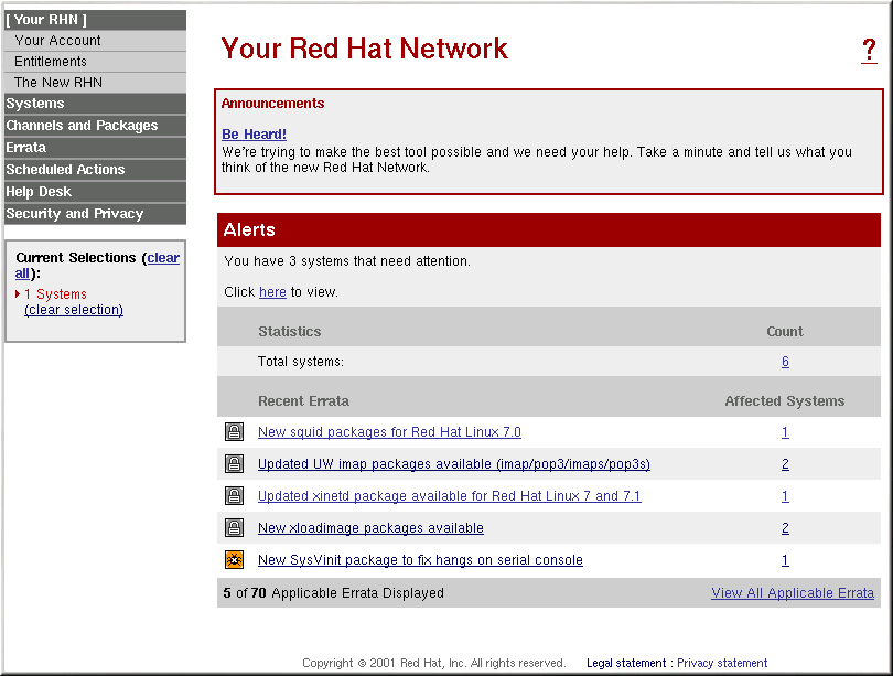 The first line of the Your Red Hat Network page shows how many systems need attention and provides a link to quickly view those systems. Clicking the here link displays the System List page that lists the systems that need attention. Refer to the Red Hat Network User Reference Guide for information on using this page.