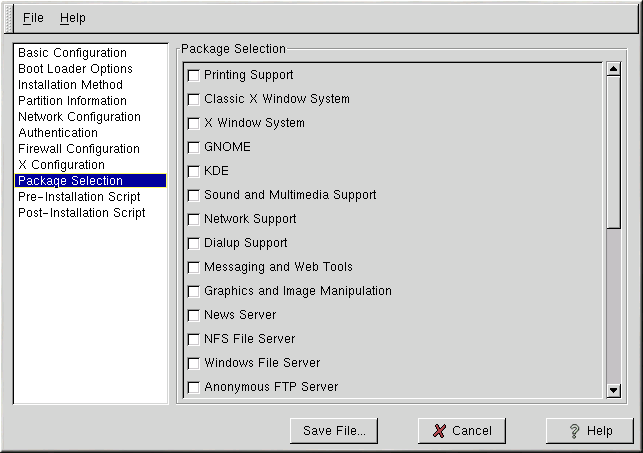 The Package Selection page allows you to choose which package categories to install. Currently, Kickstart Configurator does not allow you to select individual packages. To install individual packages, modify the %packages section of the kickstart file after you save it.
