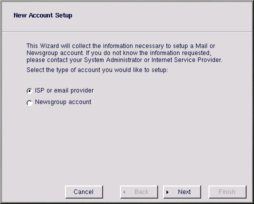 The first screen you see (Figure 6-8) asks what type of account you want to create. Select ISP or email provider and click on Next. The following screens ask for your name, email address, server names, and the name you would like to use to refer to the account (work, research, etc). Finish filling in the screens as they appear. The final screen shows the settings you just chose. Click on Finish to complete the process. The account you created will now appear in the mail folders list on the sidebar (Figure 6-7).