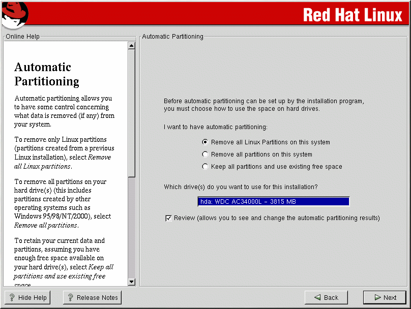 Using your mouse, choose the hard drive(s) on which you want Red Hat Linux to be installed. If you have two or more hard drives, you can choose which hard drive(s) should contain this installation. Unselected hard drives, and any data on them, will not be touched.