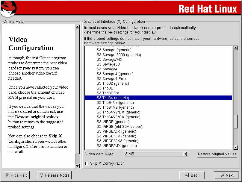 Next, enter the amount of video memory installed on your video card. If you are not sure, please consult the documentation accompanying your video card. You will not damage your video card by choosing more memory than is available, but the X server may not start correctly if you do.