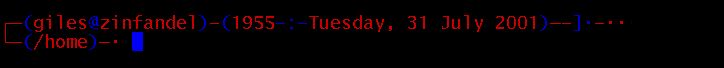 | Bash Prompt HOWTO: $Revision: 0.89 $, $Date: 2001/08/22 00:57:34 $ | ||