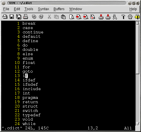 The format of a dictionary file is simple. Just put a word you want in line by itself. So a C dictionary file would look something like this.