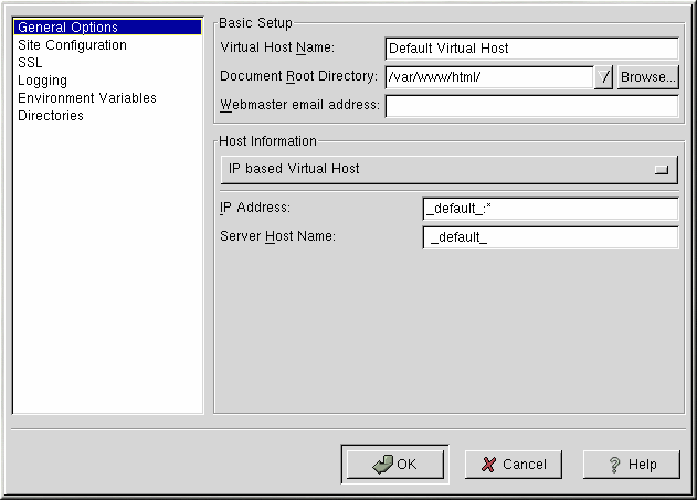 Apache Configuration Tool includes a default virtual host as shown in Figure 14-8. Refer to the section called Default Virtual Host for details about the default virtual host.