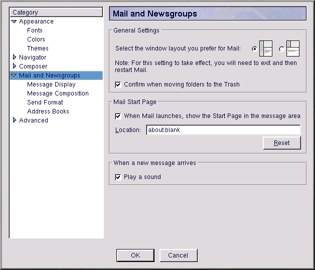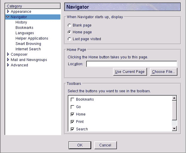 To customize Mozilla, go to Edit => Preferences. A screen appears with a list of categories on the left: Appearance, Navigator, Composer, Mail and Newsgroups, Privacy & Security, and Advanced.