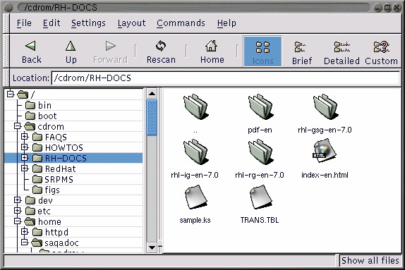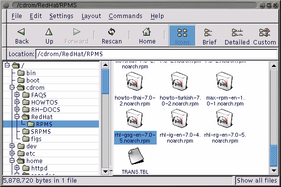 Files beginning with the letters "rhl" can be installed on your system. To do this, select the /cdrom/RedHat directory in the left window of the file manager. Expand the folder (click on the + sign) and then click on RPMS beneath it. You will see a variety of documentation files on the right.