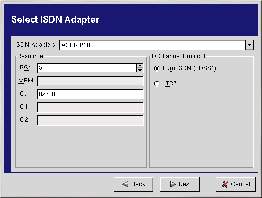 Select the ISDN adapter from the pulldown menu. Then configure the resources and D channel protocol for the adapter. Click Next to continue.