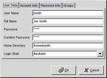 To view the properties of an existing user, click on the Users tab, select the user from the user list, and click Properties from the button menu (or choose Action => Properties from the pull-down menu). A window similar to Figure 19-3 will appear.
