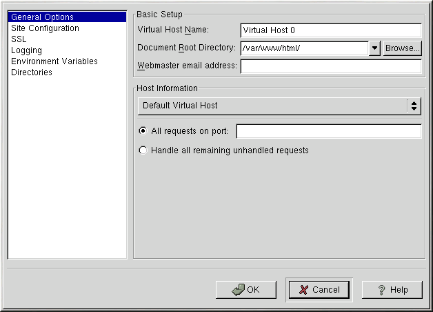 The General Options settings only apply to the virtual host that you are configuring. Set the name of the virtual host in the Virtual Host Name text area. This name is used by Apache Configuration Tool to distinguish between virtual hosts.