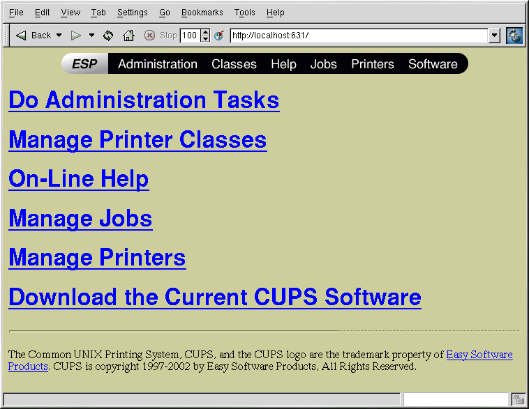 After starting the cups daemon, open a Web browser and connect to the URL http://localhost:631 as shown in Figure 21-18.