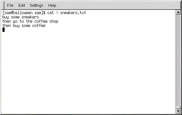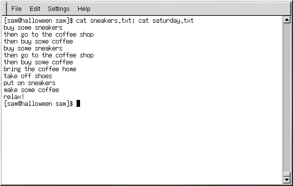 [sam@halloween sam]$cat sneakers.txt home.txt > saturday.txt