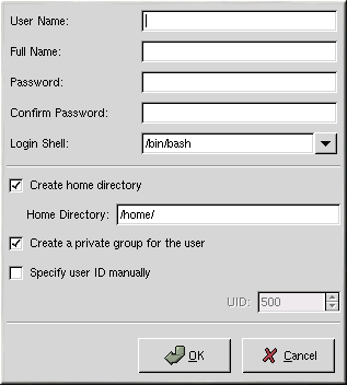 To use User Manager, you must be running the X Window System and have root privileges. To start User Manager, use one of the following methods: