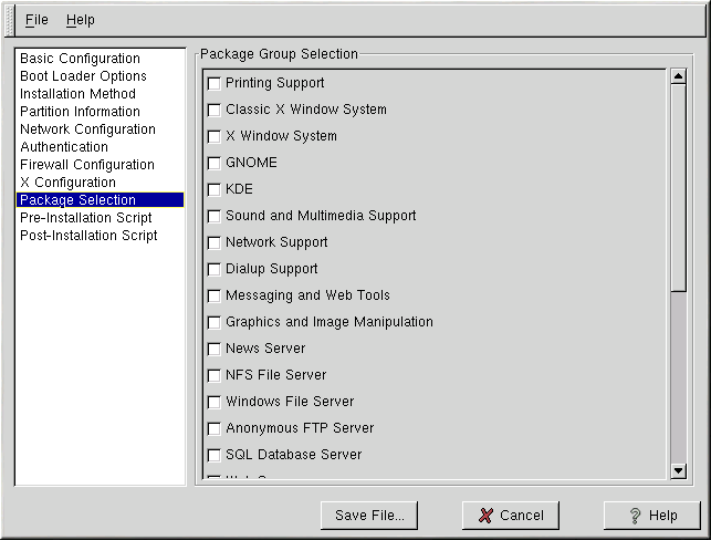 The Package Selection window allows you to choose which package categories to install. Currently, Kickstart Configurator does not allow you to select individual packages. To install individual packages, modify the %packages section of the kickstart file after you save it.